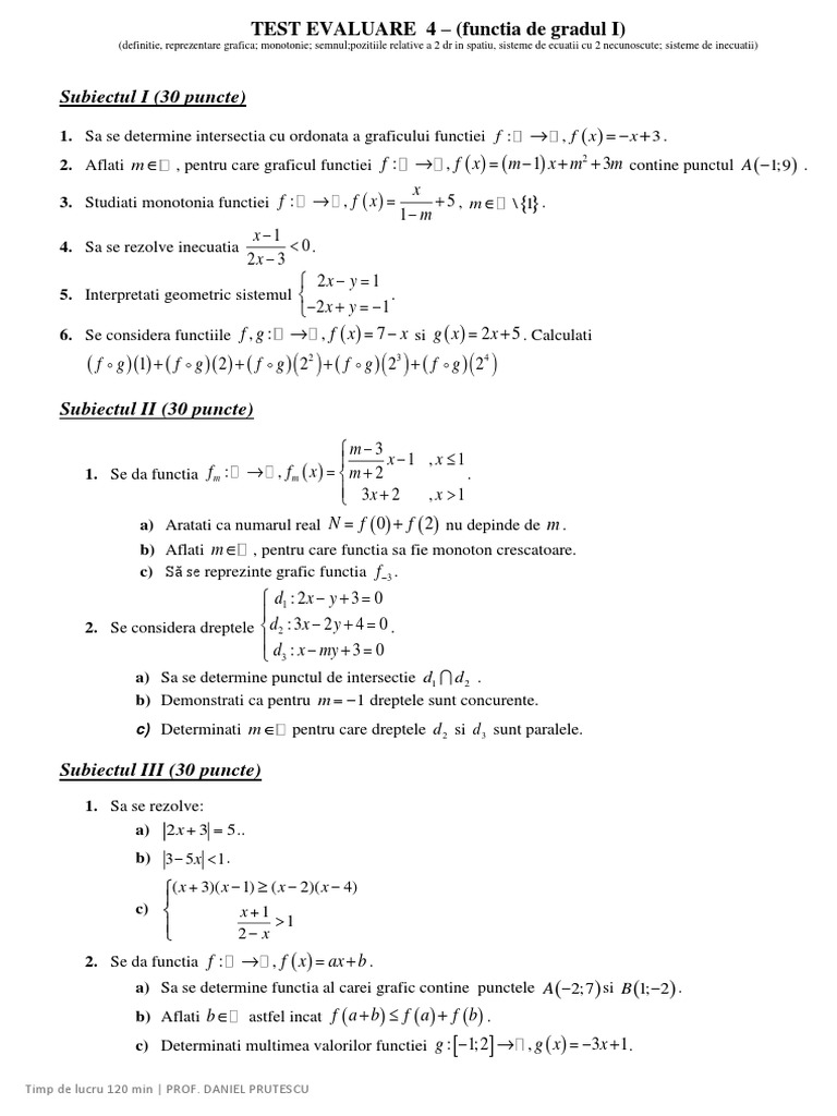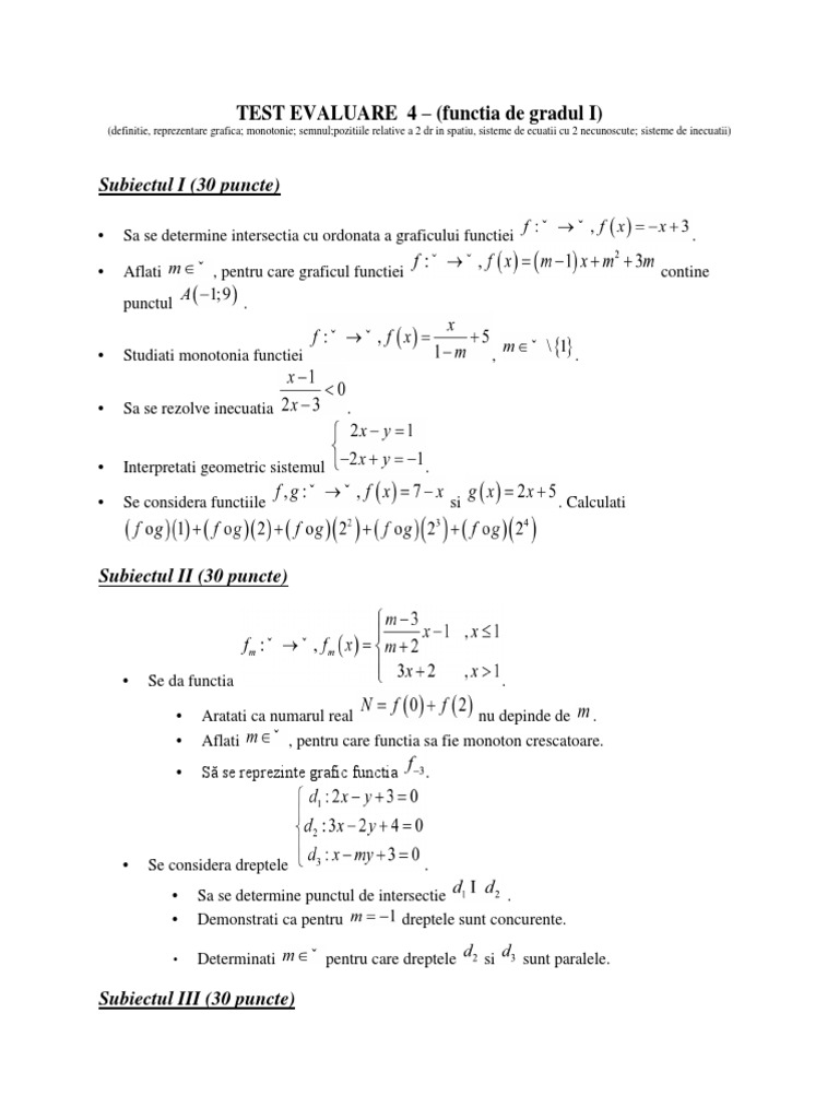 Subiectul I 30 Puncte Test Evaluare 4 Functia De Gradul I