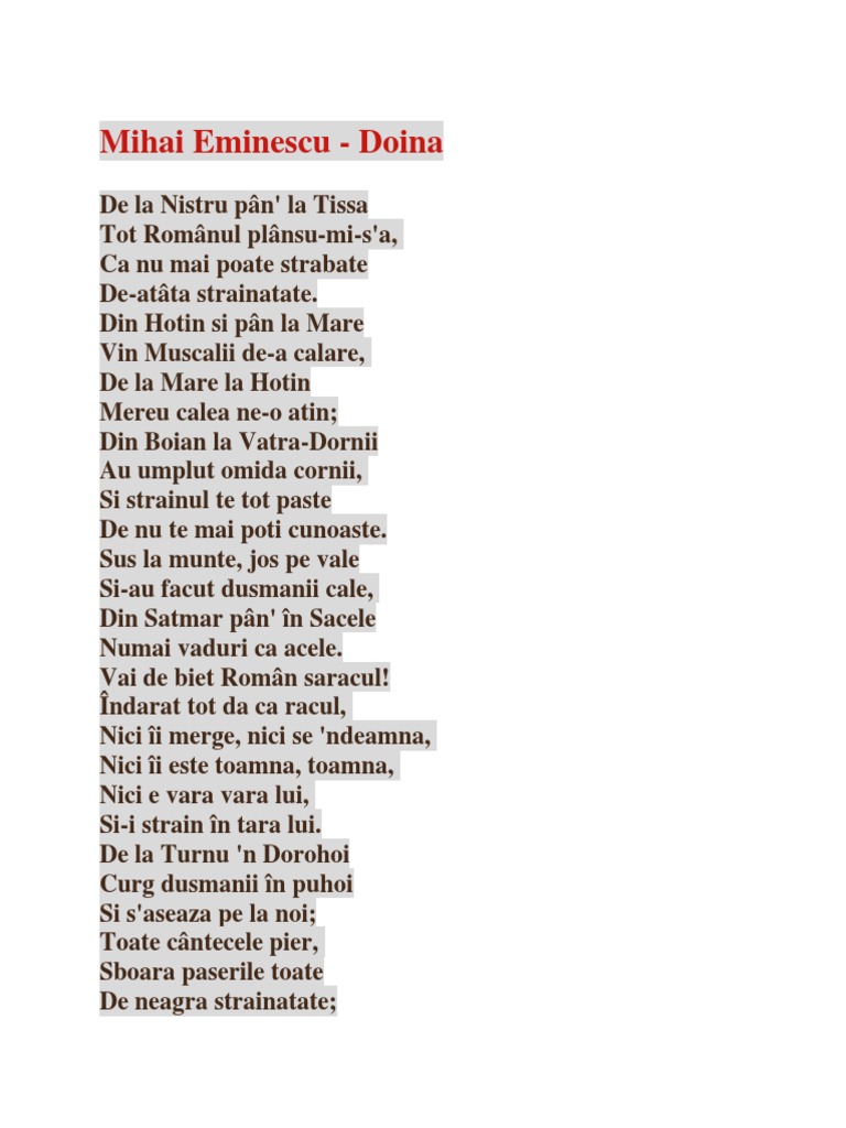 Cuvantul Liber Mic Istoric Al Poeziei Doina De Mihai Eminescu I