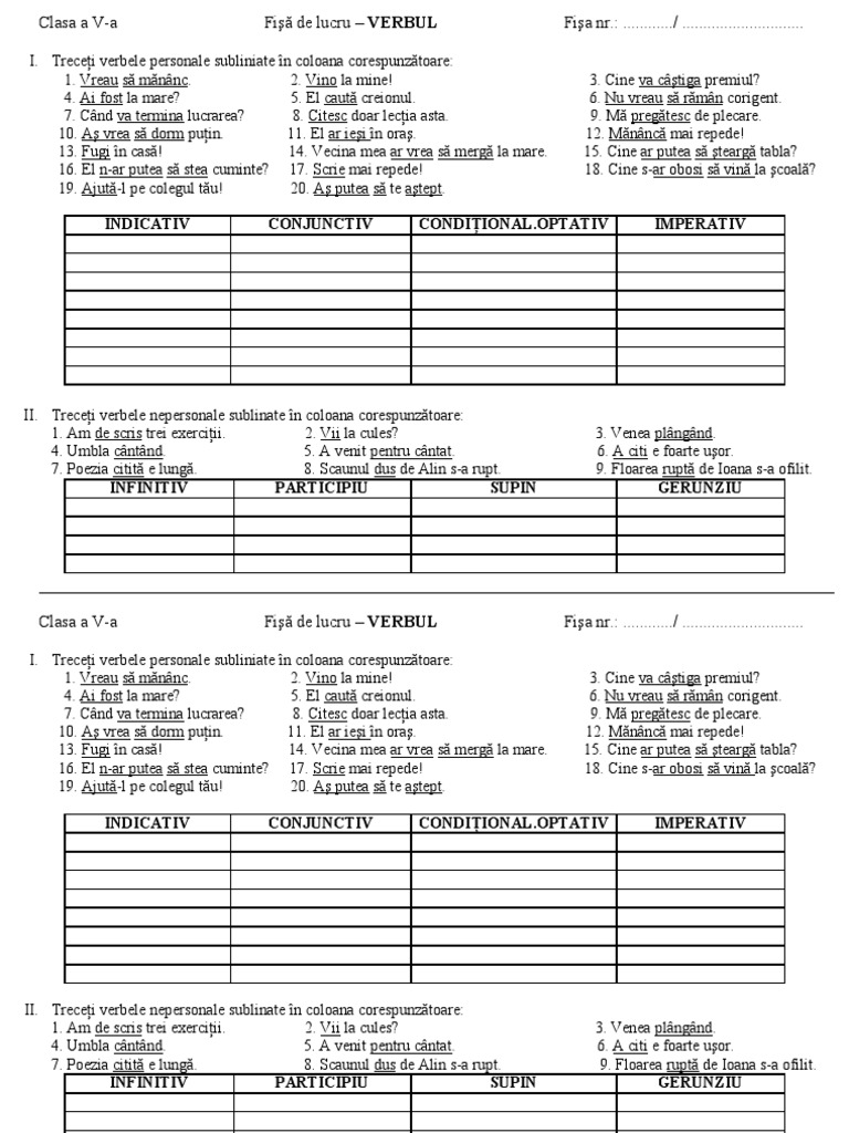Clasa a vii a fişă de lucru modurile verbului profesor roxana oniga scoala comanesti judetul bacau i. Treceţi verbele personale subliniate în coloana corespunzătoare. Fisele sunt foarte utile atat pentru activitatea din clasa in cadrul orelor de curs cat si pentru aprofundare individuala. Primul material din documentul atașat la finalul articolului prezintă un roboțel ce va fi împodobit cu tot ceea ce am aflat despre pronumele personal.
