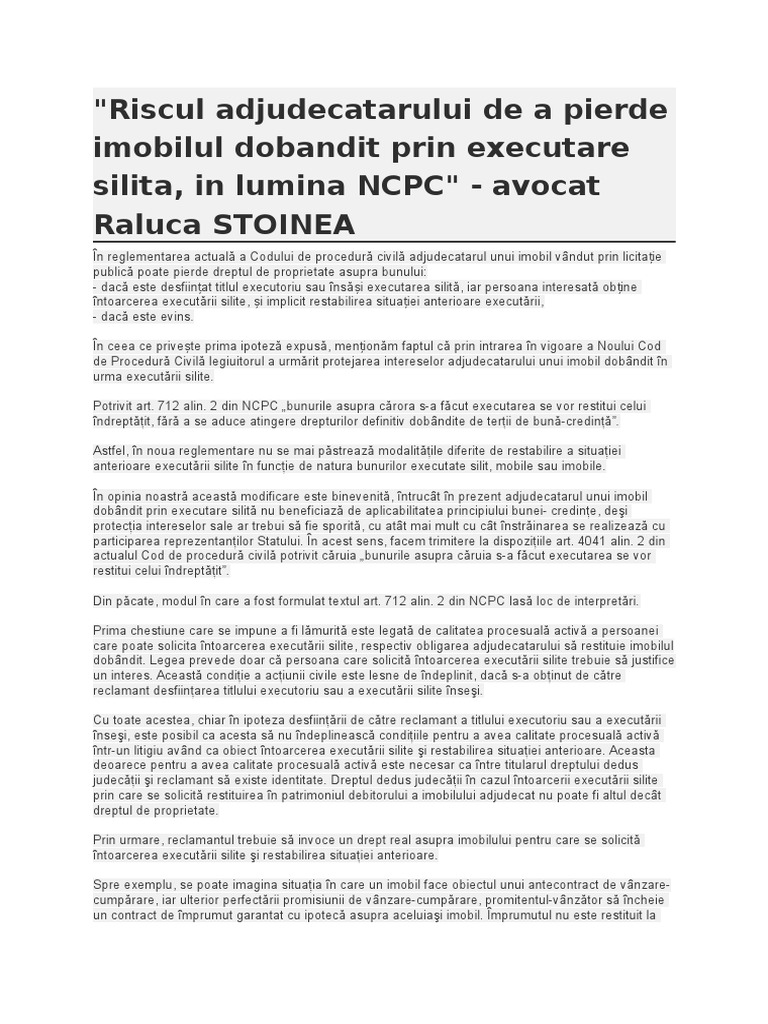 Riscul Adjudecatarului De A Pierde Imobilul Dobandit Prin Executare Silita
