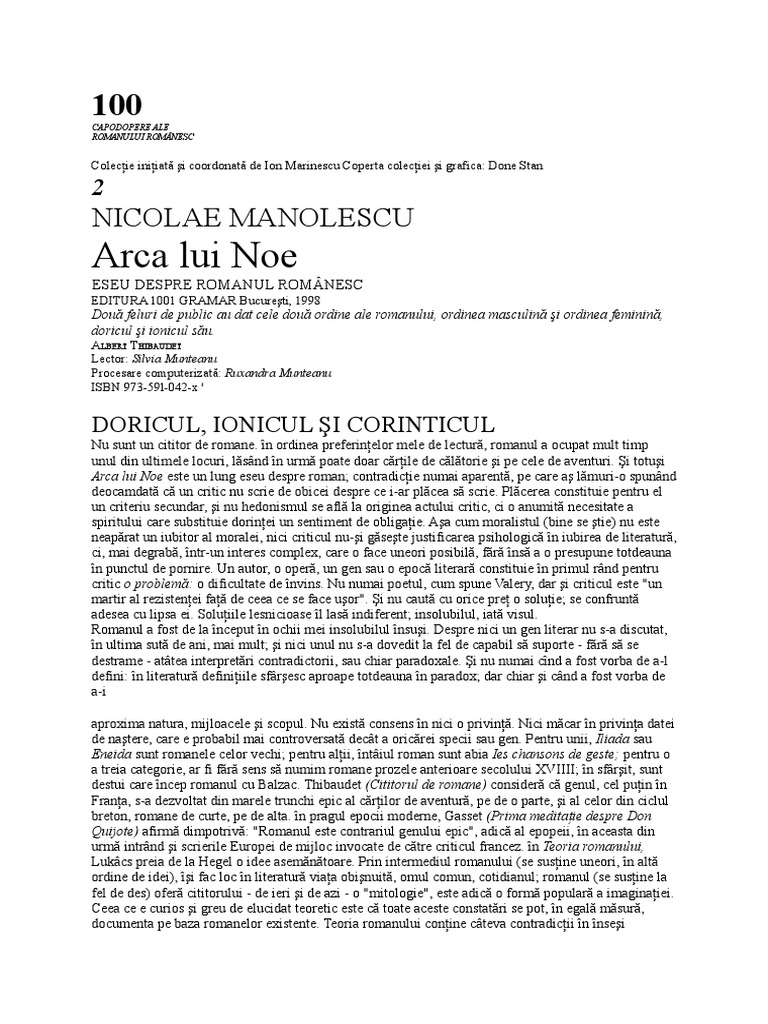 Arca Lui Noe Eseu Despre Romanul Romanesc By Nicolae Manolescu