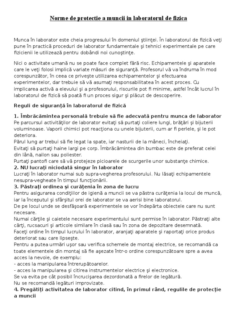 Norme De Protectie A Muncii In Laboratorul De Fizica Docx