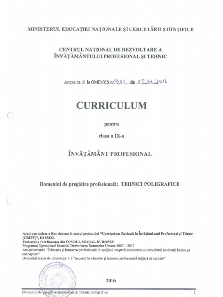 Curriculum Clasa A Ix A Invăţămant Profesional Domeniul De Pregătire Tehnici Poligrafice