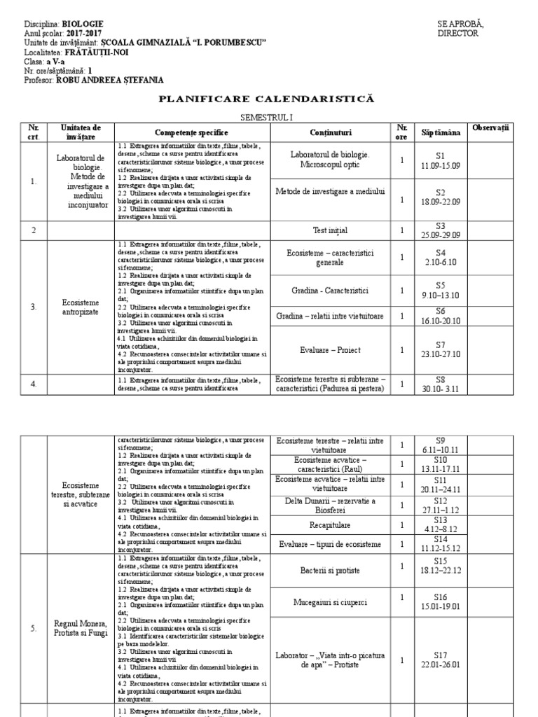Planificare Biologie Pentru Clasa A V A Planificari Clasa V A Planificări