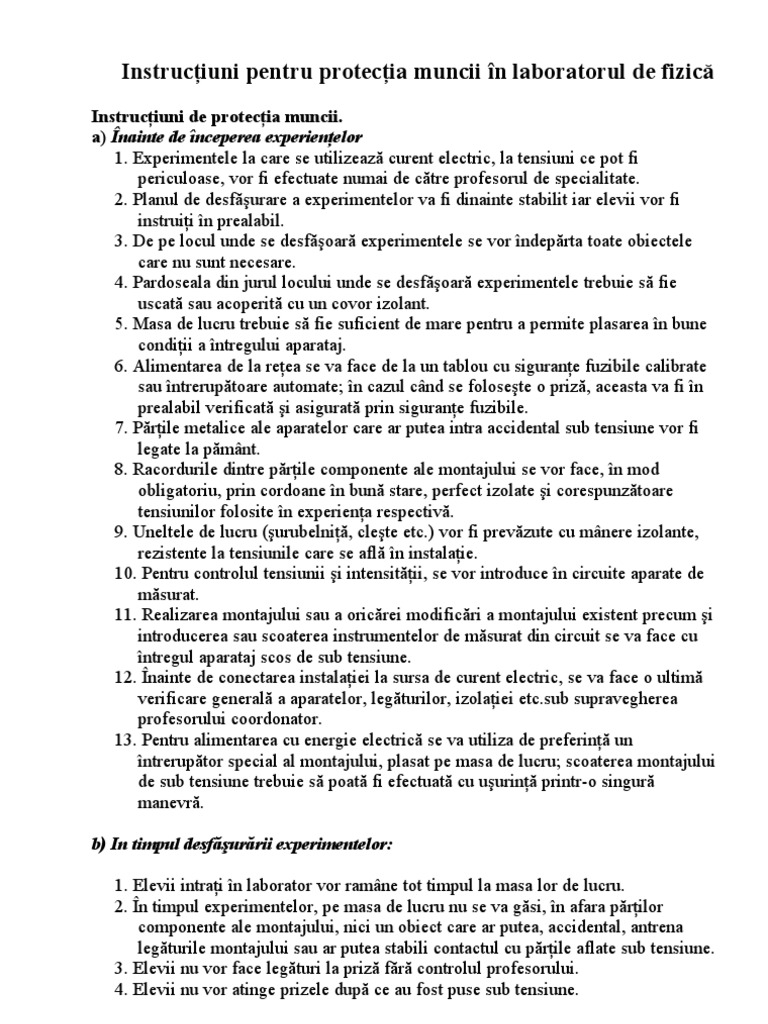 Instrucţiuni Pentru Protecţia Muncii In Laboratorul De Fizică