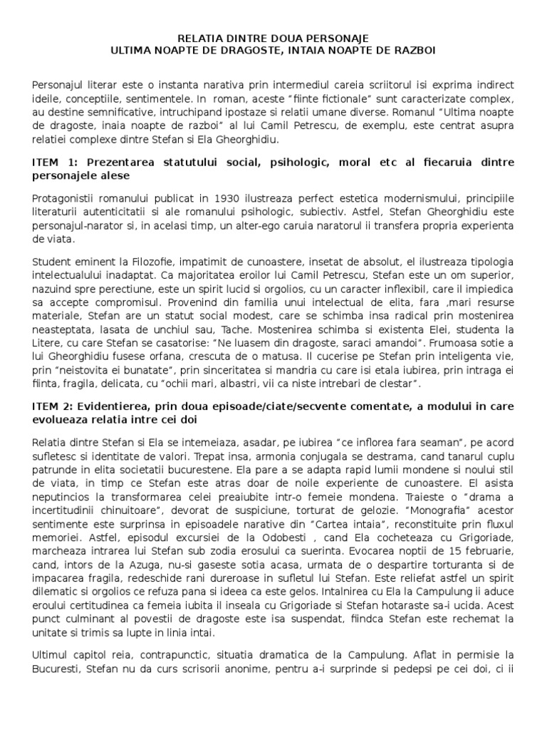 Eseu Relaţia Dintre Două Personaje Ultima Noapte De Dragoste