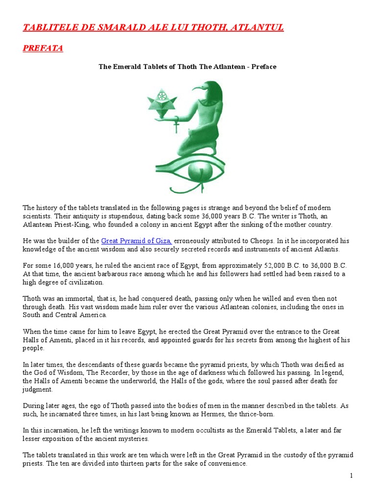 Tablitele De Smarald Ale Lui Thoth Atlantul Contin Istoria Secreta A Omenirii Referinte Despre Sala Inregistrarilor De Sub Marea Piramida Din Egipt Si Au O Vechime De 36 Pdf Document
